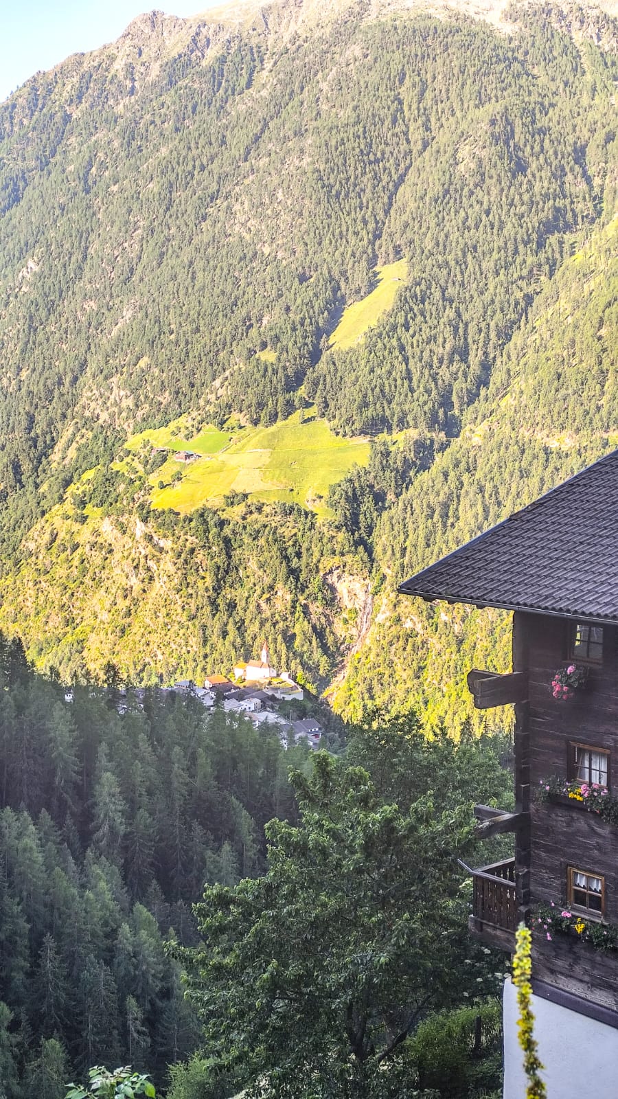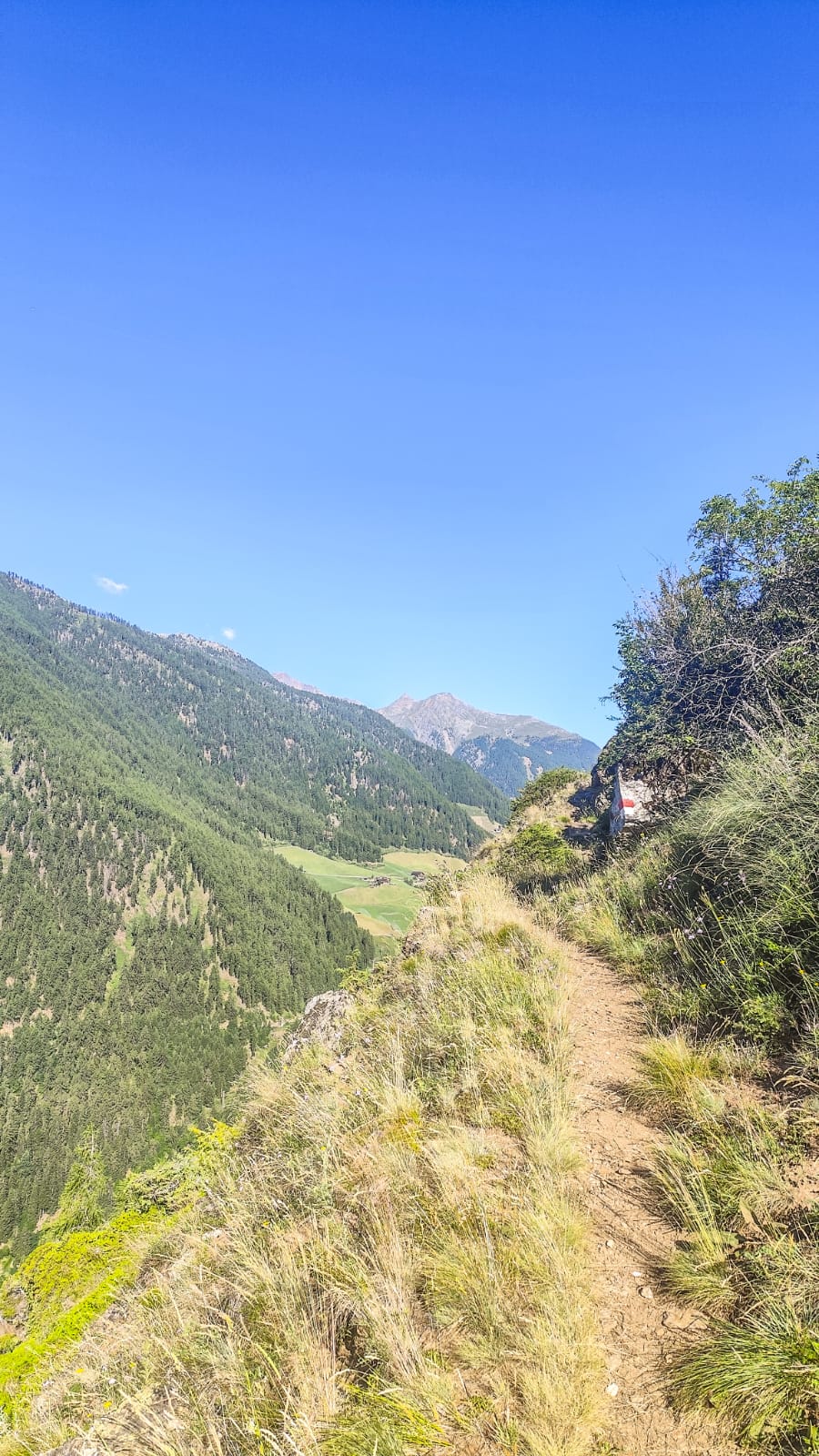 Die letzten zwei Tage spürten wir deutlich in den Beinen, doch zu Beginn der Etappe fühlte sich alles noch gut an. Das änderte sich jedoch mit dem steilen Abstieg, den die, gestern erwähnte, Umleitung mit sich brachte. Die Motivation sank zusätzlich, als wir fast zwei Kilometer der Straße entlang bergauf wandern mussten, um endlich wieder auf den Meraner Höhenweg zu gelangen.